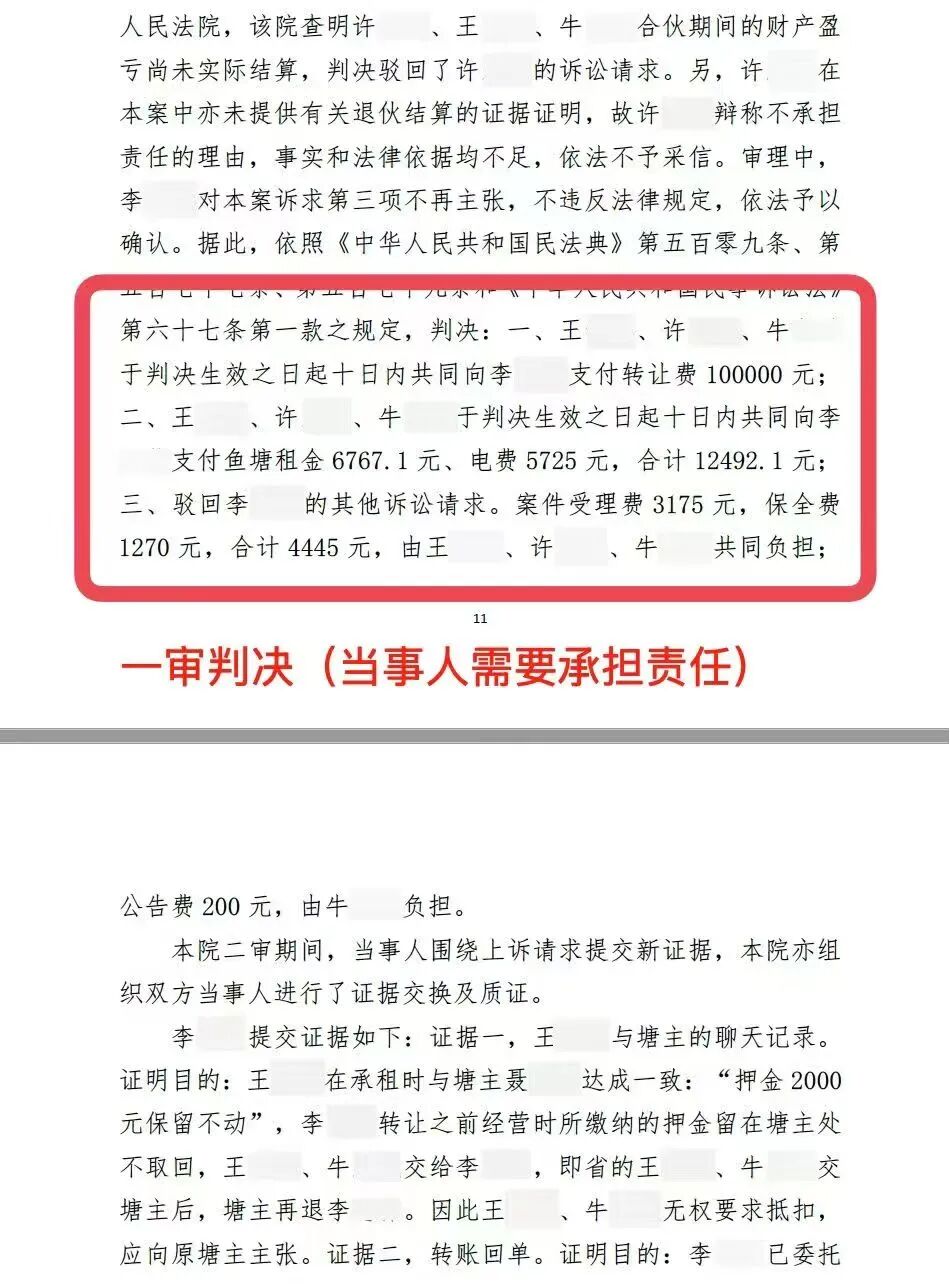 一审法院审理后认为,许某系代表其与王某、牛某三人共同签订合同,且王某、牛某实际参与了鱼塘经营,故判决三被告共同承担付款责任。王某、牛某对一审判决不服,委托袁昌鑫律师提起上诉。