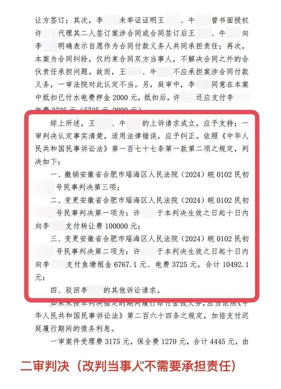 二审判决认为,案涉《鱼塘经营权转让合同》的签约双方为李某与许某,根据合同相对性原则,仅对双方当事人具有法律约束力。李某未能提供证据证明王某、牛某曾书面授权许某代理其签订合同,也未证明合同签订后王某、牛某向其明确表示自愿作为合同付款义务人共同承担责任。