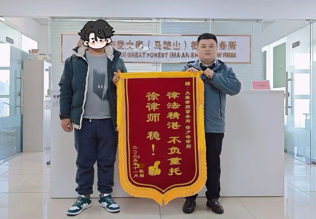 2025年11月22日,大森(马鞍山)律师事务所的主任徐夕峰律师收到当事人赠送的绣有“律法精湛不负重托,徐律师稳!”字样的锦旗。