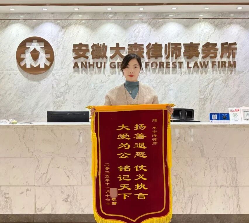 2025年11月24日,大森(芜湖)律师事务所的李跟律师收到当事人专程送来的锦旗,锦旗上书“专业敬业律法精湛,尽心尽责不负重托”字样。