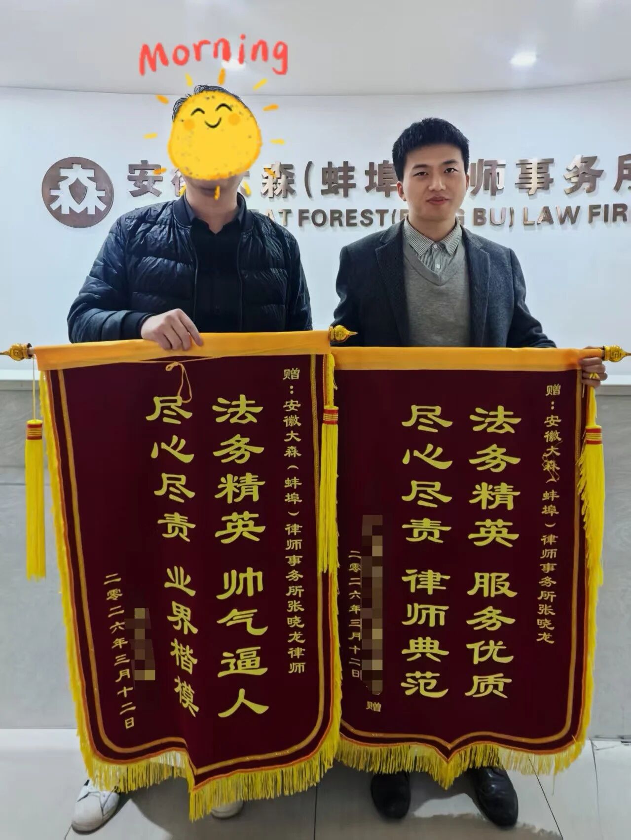 近日,大森律师事务所马鞍山分所的张晓龙律师收到当事人送来的两面锦旗,锦旗上分别绣有“法务精英服务优质 尽心尽责律师典范”与“法务精英帅气逼人,尽心尽责业界楷模”字样。这份特殊的“双倍认可”,承载着当事人对张律师专业能力的高度肯定。