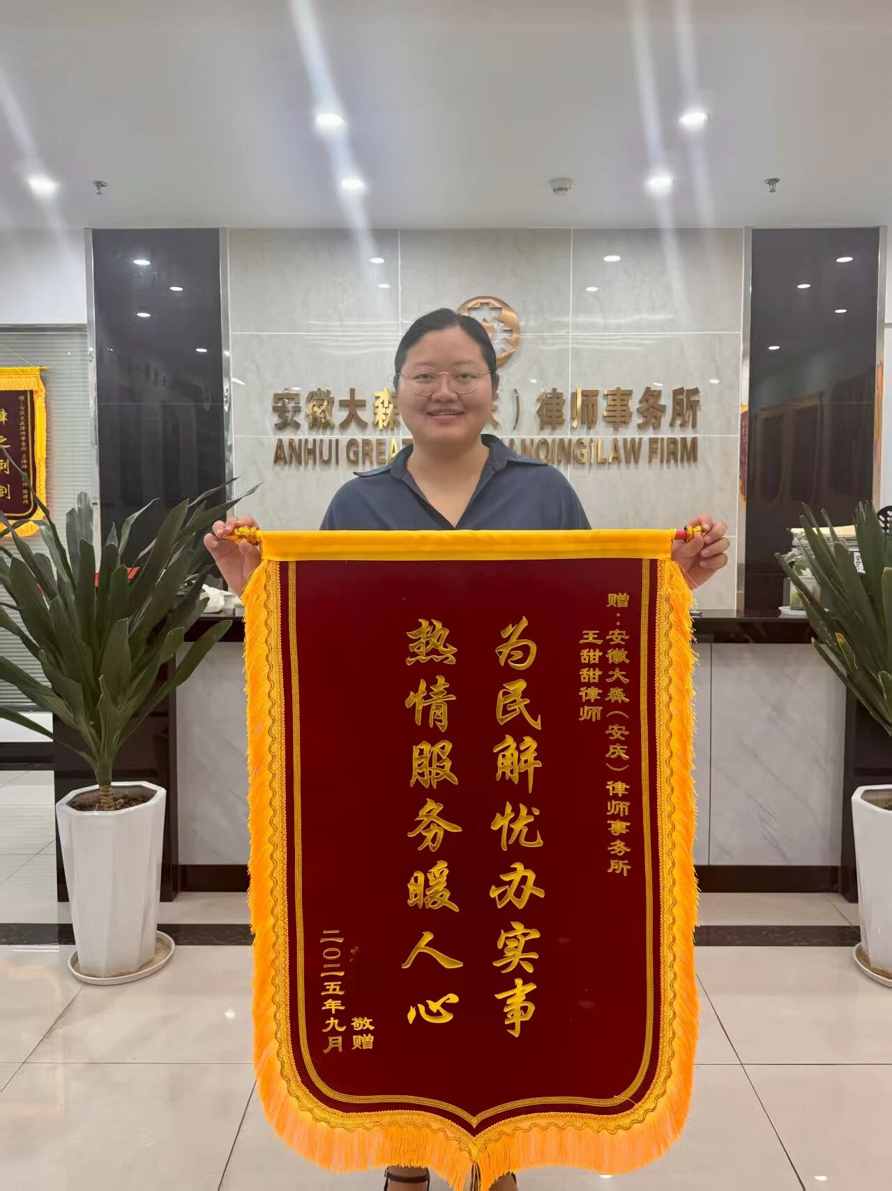 9月6日,安徽大森(安庆)律师事务所的王甜甜律师收到了当事人赠送的一面书有“为民解忧办实事,热情服务暖人心”的锦旗。
