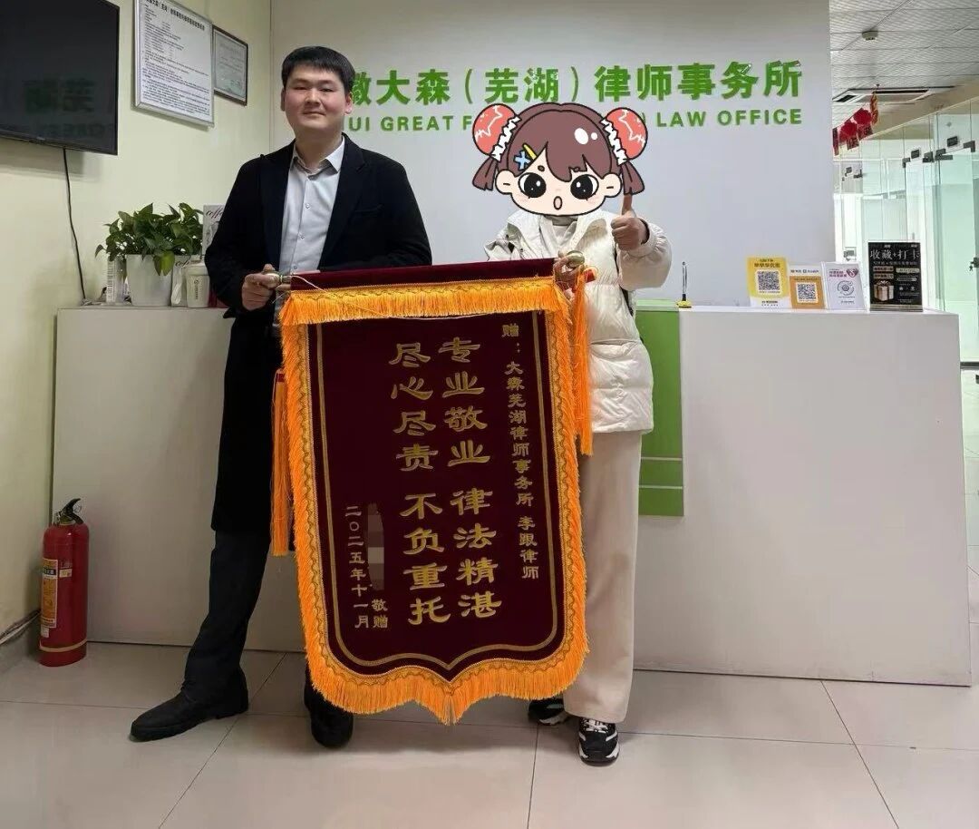 2025年11月24日,大森(芜湖)律师事务所的李跟律师收到当事人专程送来的锦旗,锦旗上书“专业敬业律法精湛,尽心尽责不负重托”字样。