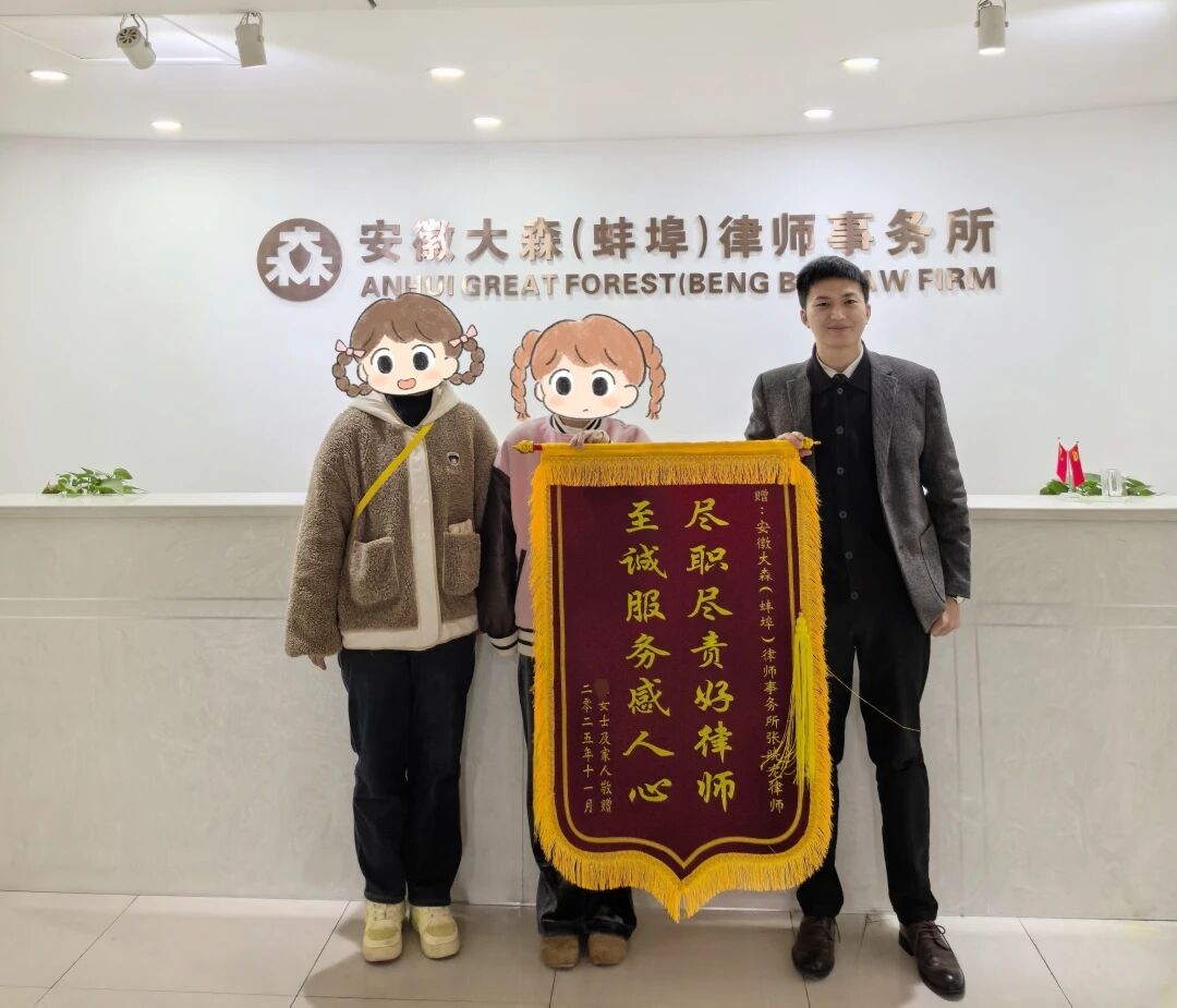 2025年11月25日,安徽大森(蚌埠)律师事务所的张晓龙律师收到当事人赠送的一面书有“尽职尽责好律师,至诚服务感人心”的锦旗。